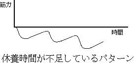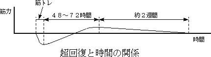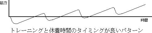 そのままで続けると、楽になってくるので徐々に伸びなくなってしまします。また、休養も取りすぎると回復が終了し筋力は徐々に落ちてきます。トレーニング前に戻ってしまうのが約2週間と言われています。回復と繰り返しと時間の関係を下図に示してみました。